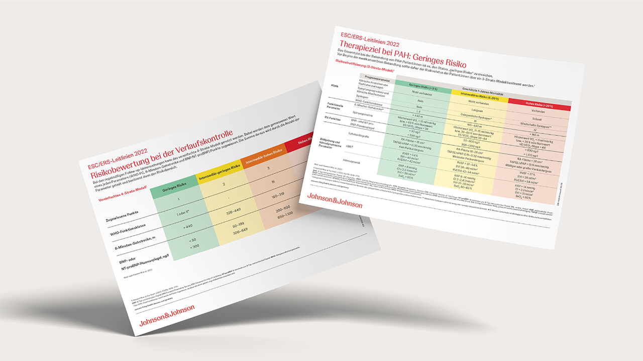 Ein wichtiger Bestandteil bei der Diagnose einer pulmonal arteriellen Hypertonie (PAH) ist die Risikostratifizierung der Patient:innen zur Abschätzung des Risikos (geschätzte 1-Jahres-Mortalität). Die Risikostratifizierung erfolgt anhand verschiedener Parameter, wie WHO-Funktionsklasse, 6-Minuten-Gehstrecke, BNP-/NT-proBNP-Wert, Auftreten von Synkopen sowie weiteren Parametern aus Bildgebung und Hämodynamik, von denen die meisten auch eine Rolle bei der initialen Diagnostik der PAH spielen.1