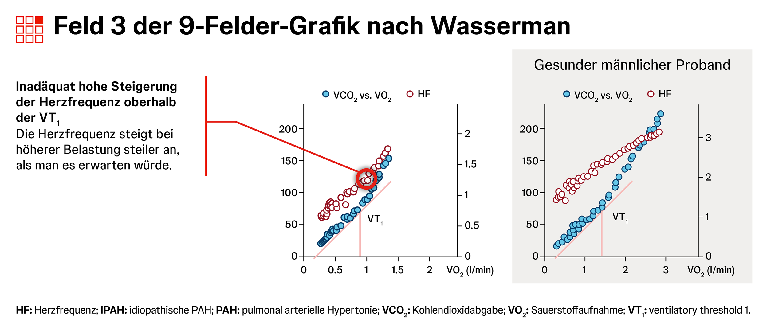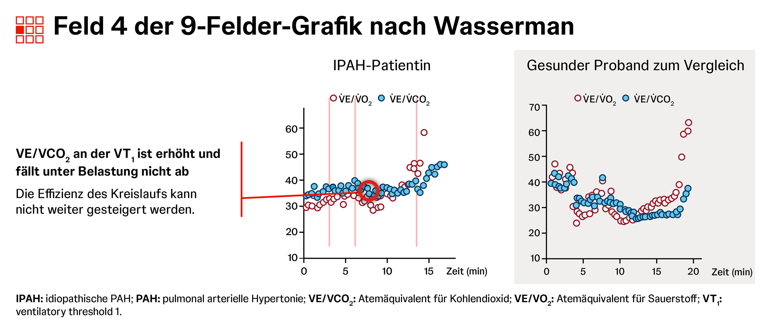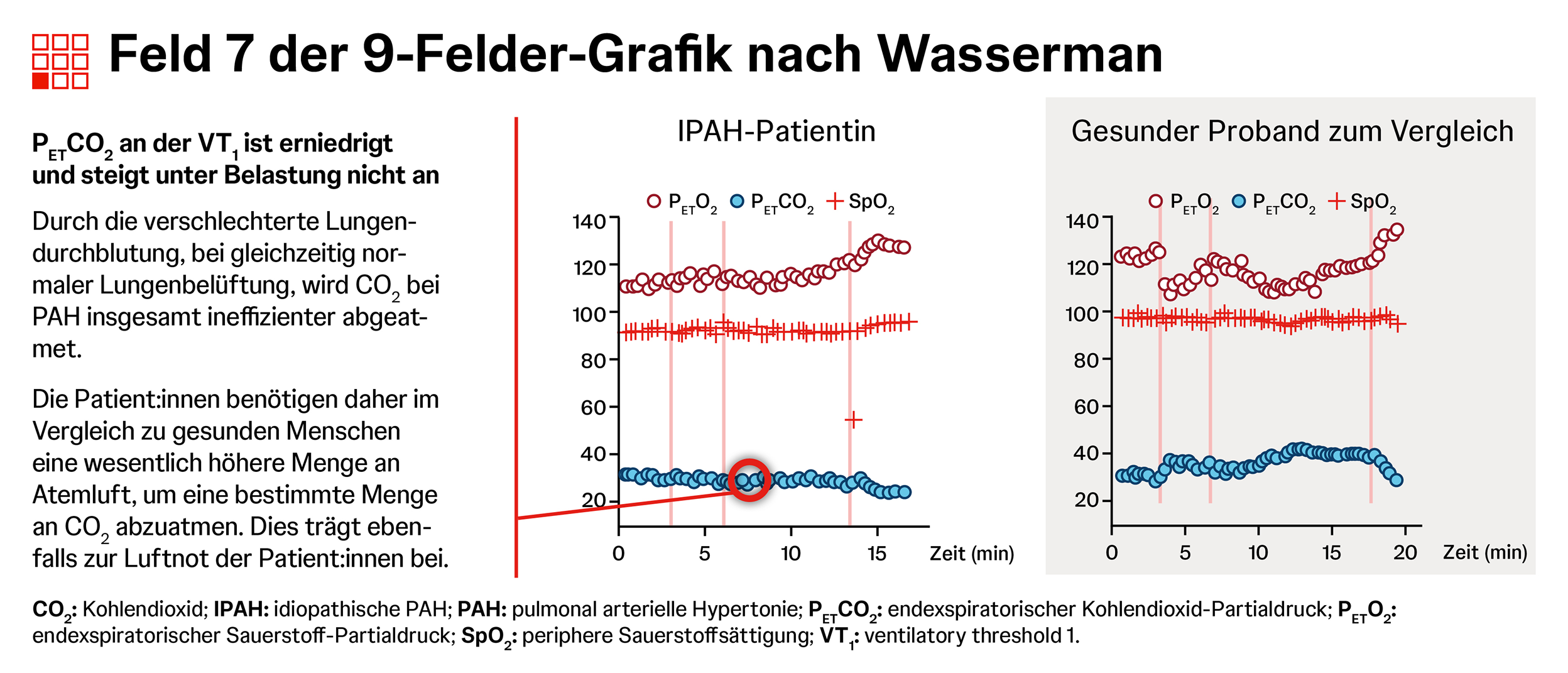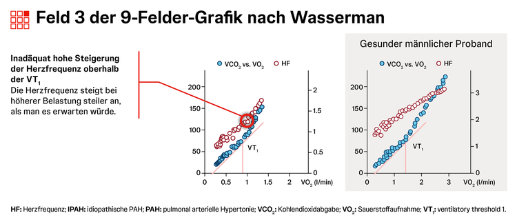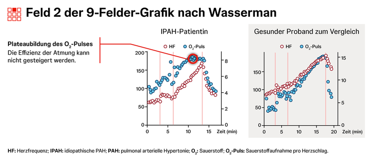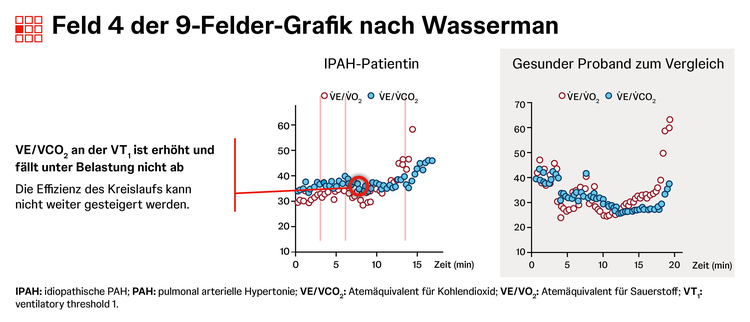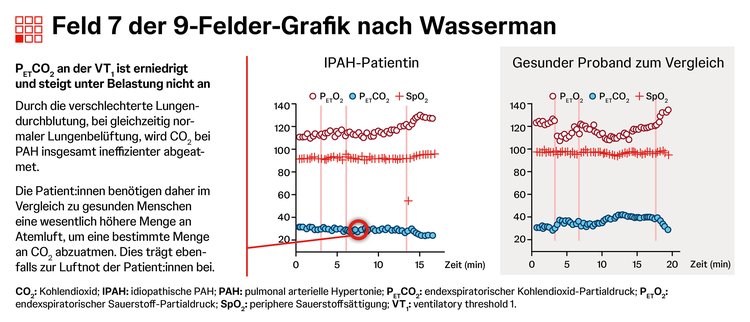 Die Spiroergometrie zeigt bei PAH oft ein typisches Muster für Belastungsintoleranz aus niedrigem PETCO2, erhöhtem VE/VCO2, erniedrigtem O2-Puls und erniedrigter maximaler O2-Aufnahme.1