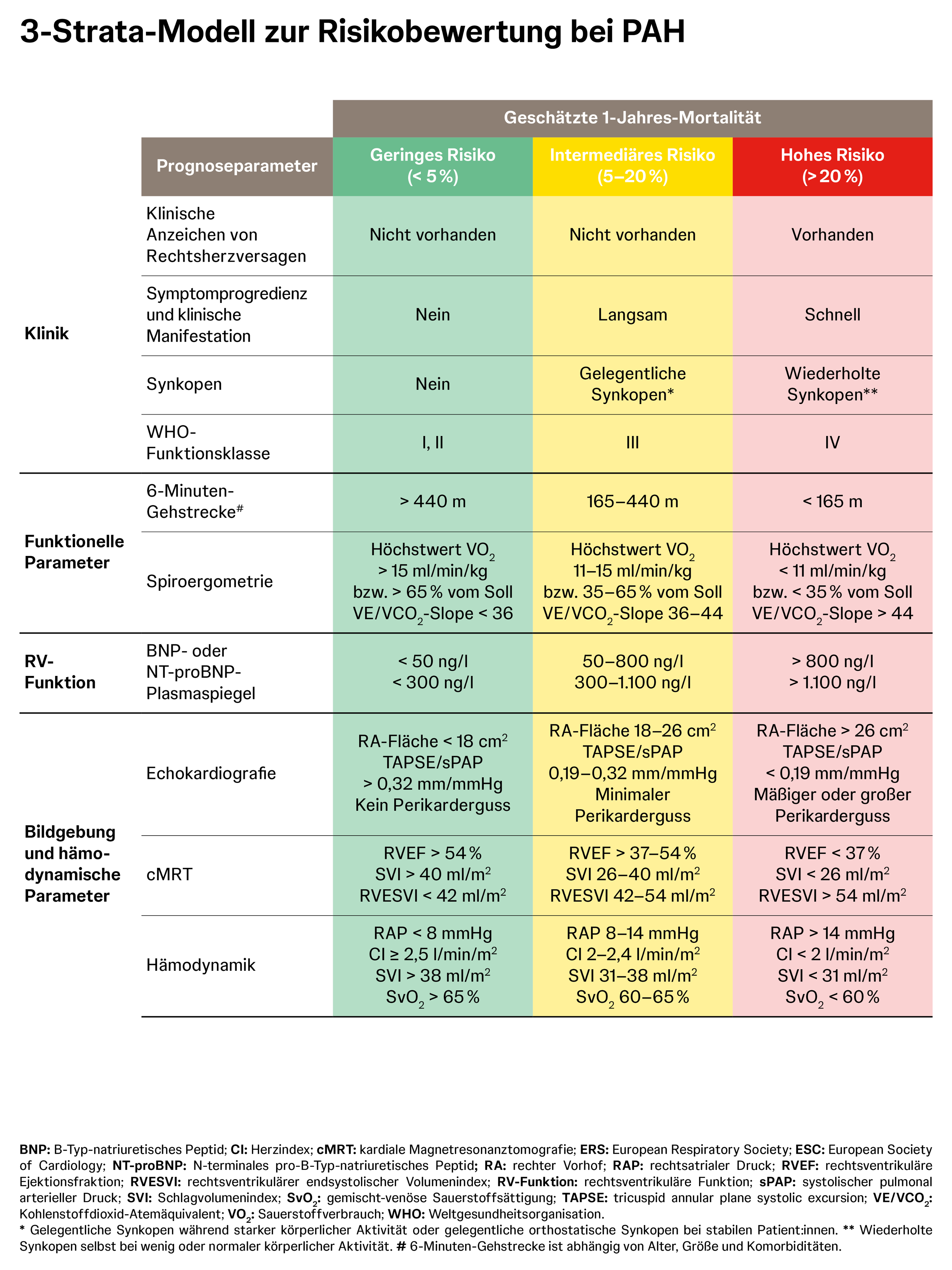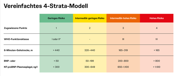 Zur Überwachung der Therapie im Verlauf kann ein vereinfachtes 4-Strata-Modell (anhand der Parameter WHO-Funktionsklasse, 6-Minuten-Gehstrecke und BNP/NT-proBNP) genutzt werden.1