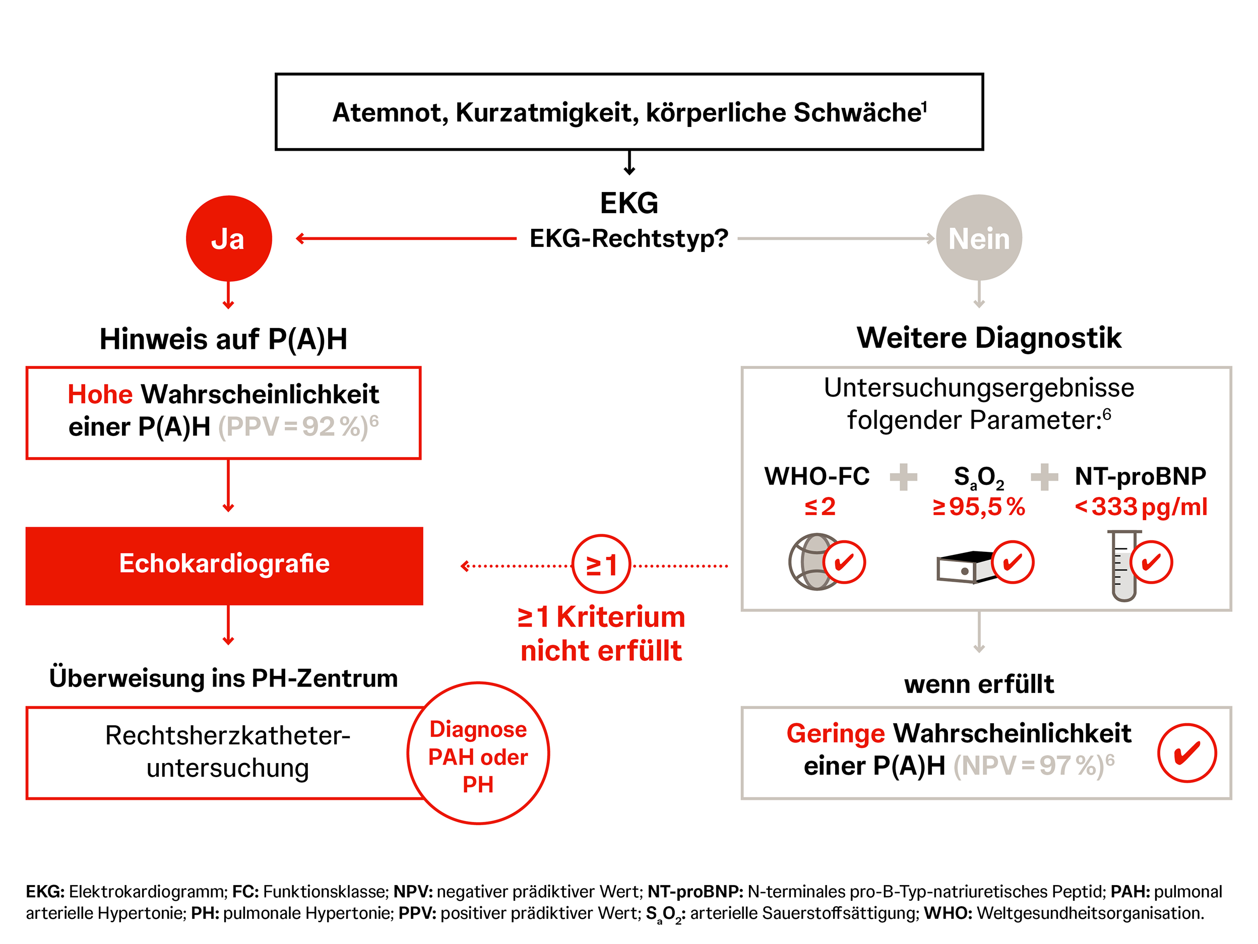 Mit einfacher Diagnostik, wie dem EKG, kann der Weg zur Diagnose entscheidend verkürzt werden – dabei kann ein einfacher Algorithmus helfen. Liegt bei Symptomen wie Atemnot, Kurzatmigkeit, Schwäche und Synkopen ein EKG-Rechtstyp vor, ist die Wahrscheinlichkeit für das Vorliegen einer P(A)H relativ hoch und eine Echokardiografie kann weiteren Aufschluss liefern.1, 6 Liegt kein EKG-Rechtstyp vor, so schließt das eine P(A)H nicht zwangsläufig aus.1 In diesem Fall sind weitere diagnostische Parameter wie beispielsweise die Bestimmung des NT-proBNP-Wertes (N-terminales pro-B-Typ-natriuretisches Peptid) notwendig, um das Vorliegen oder Nichtvorliegen einer PAH weiter einschätzen zu können.6