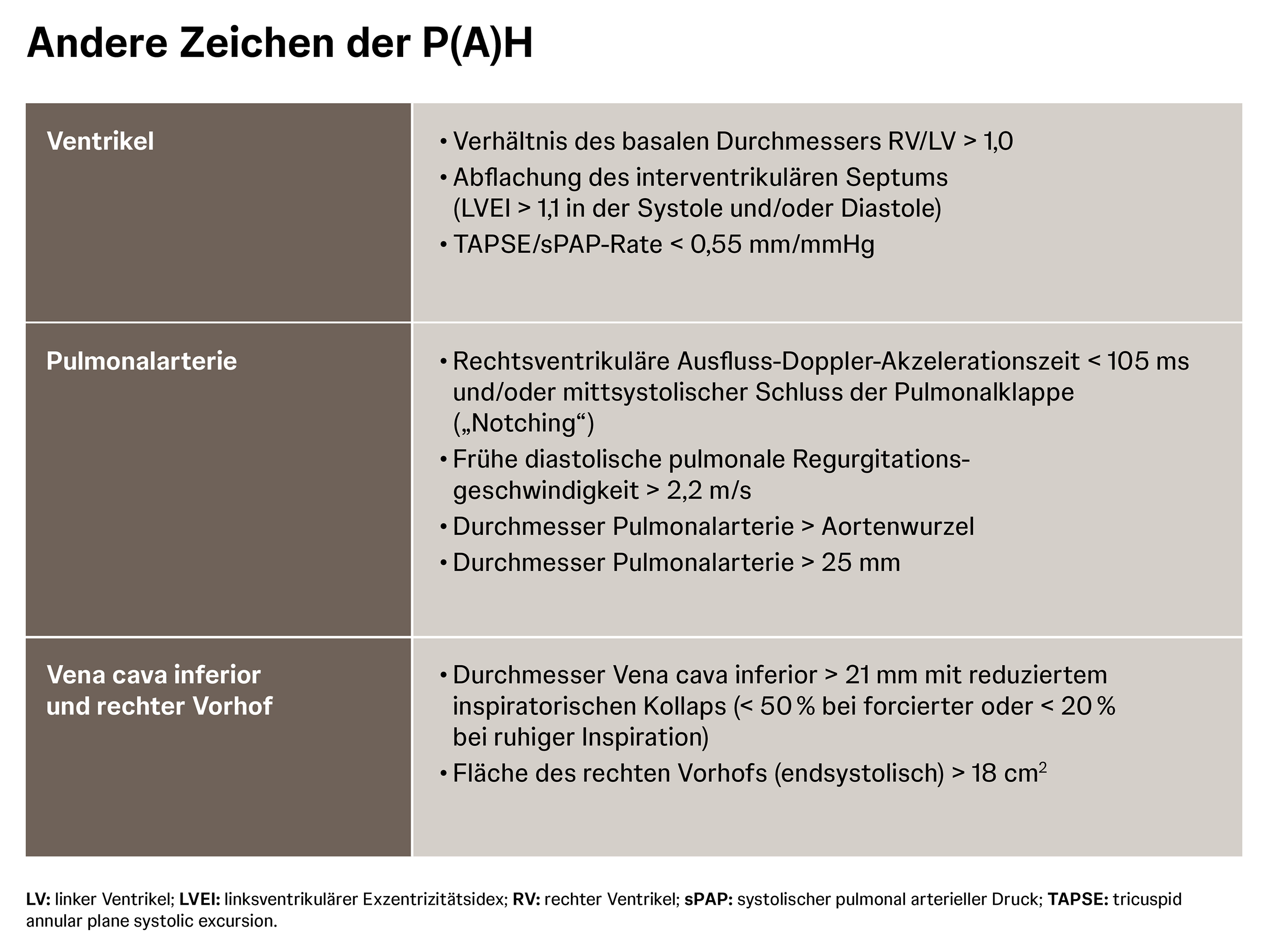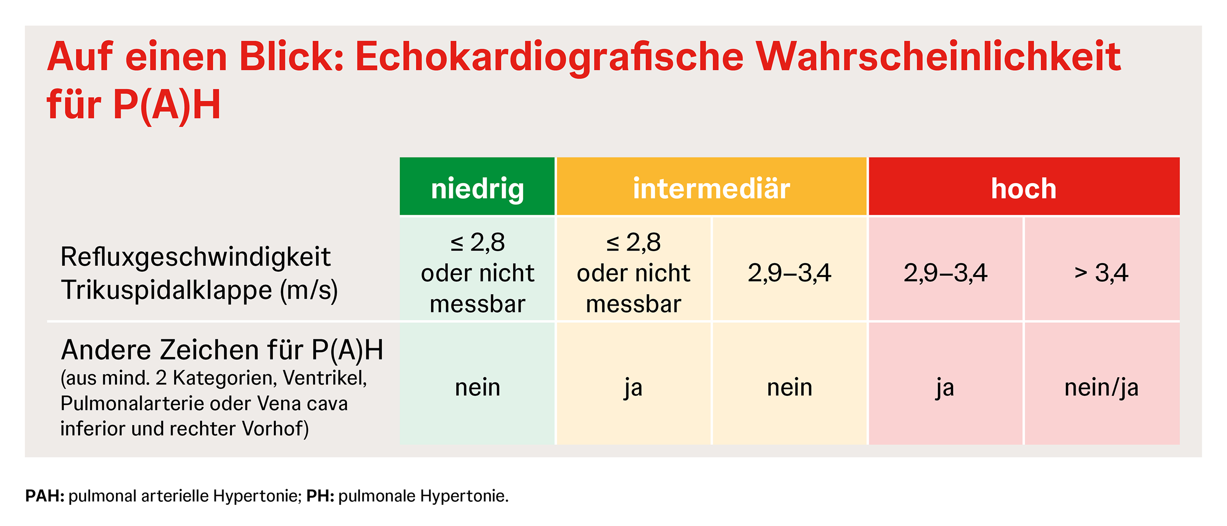 Anhand der trikuspidalen Regurgitationsgeschwindigkeit und weiterer Variablen lässt sich die Wahrscheinlichkeit einer P(A)H abschätzen. Auf diese Art und Weise kann anhand der Echokardiografie oft entschieden werden, ob eine Überweisung ins PH-Zentrum für eine Rechtsherzkatheteruntersuchung notwendig ist. Einzelne Echokardiografie-Parameter sind in der Regel nicht geeignet, um eine verlässliche Aussage über den PH-Status oder eine zugrunde liegende Erkrankung zu treffen.1