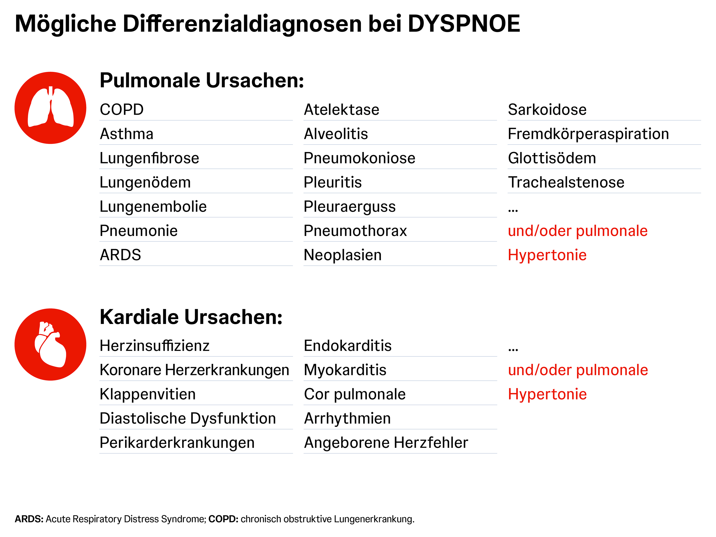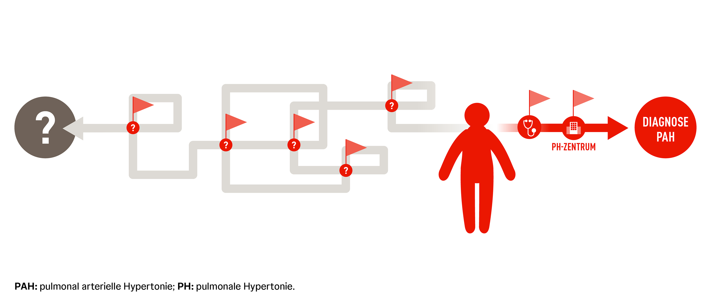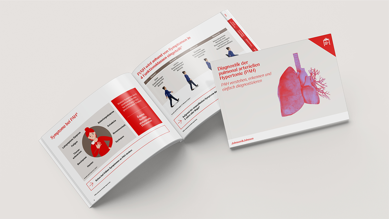 Zunehmende Belastungsdyspnoe gilt als Leitsymptom bei beiden Formen der Krankheit.1 Da Dyspnoe ein sehr unspezifisches Symptom ist, kann sie aber auch auf unterschiedliche andere pulmonale und kardiale Ursachen oder Grunderkrankungen hindeuten. Häufige Differenzialdiagnosen sind dabei Asthma, COPD oder koronare Herzkrankheiten. Obwohl diese Krankheitsbilder häufiger vorkommen, lohnt es sich, bei Dyspnoe auch an P(A)H zu denken. Denn P(A)H ist zwar seltener, aber behandelbar und eine frühe Diagnose und ein früher Therapiestart können die Prognose bei P(A)H verbessern.