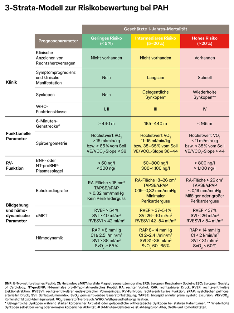 Initial sollte die Risikostratifizierung anhand eines umfangreichen 3-Strata-Modells erfolgen. Dazu gehören unter anderem die BNP-/NT-proBNP-Plasmaspiegel, die Spiroergometrie, die Echokardiografie und die Hämodynamik. Da keiner der Parameter für sich allein in Bezug auf die Prognose aussagekräftig ist, sollte stets ein multidimensionaler Ansatz aus möglichst vielen Parametern bei der Risikostratifizierung verfolgt werden.