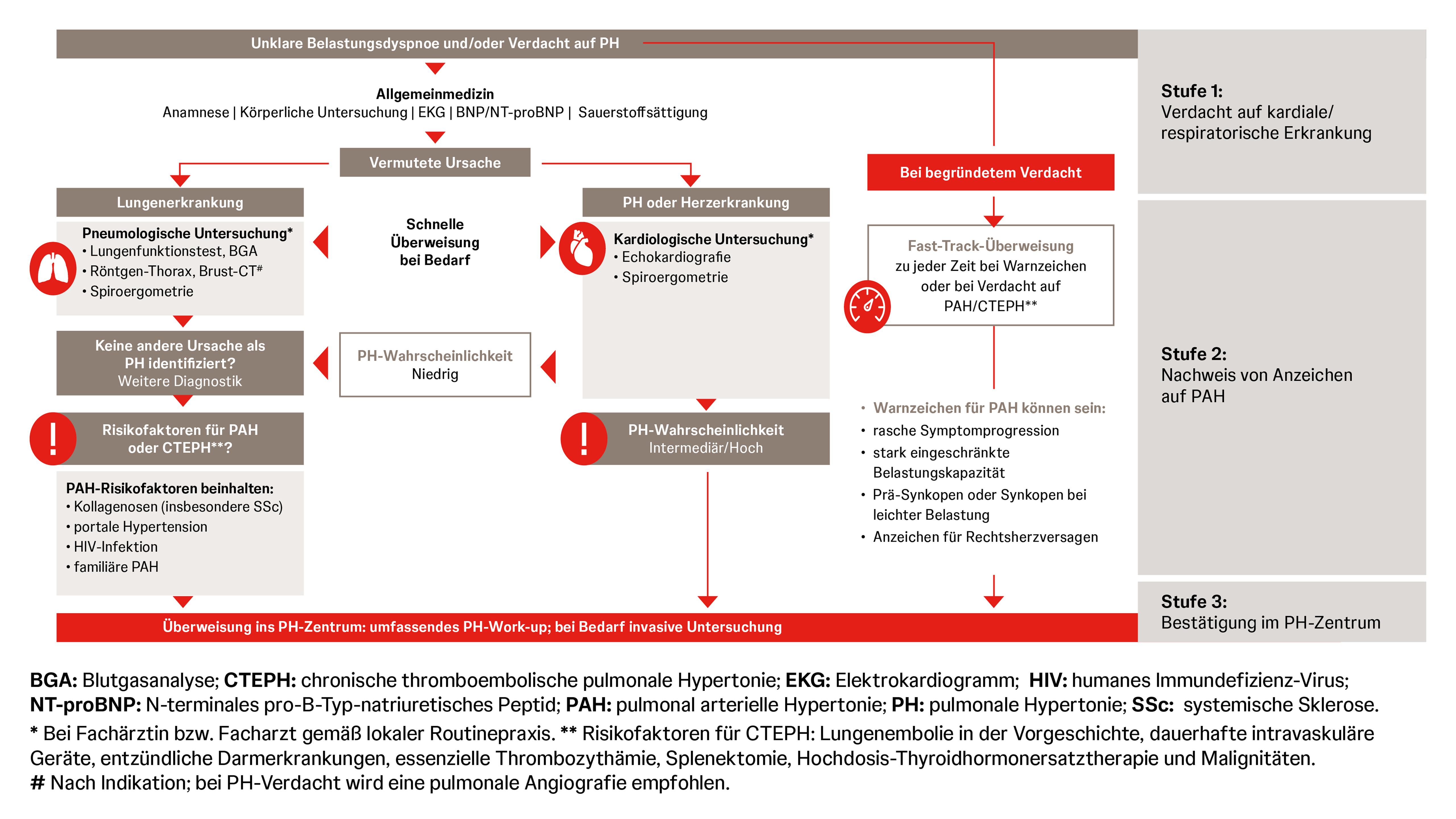 Ein möglicher Diagnosealgorithmus für pulmonale Hypertonie (PH) und pulmonal arterielle Hypertonie (PAH) leitet sich aus den Leitlinien-Empfehlungen der European Society of Cardiology/European Respiratory Society (ESC/ERS) ab. Dieser umfasst 3 Stufen:1