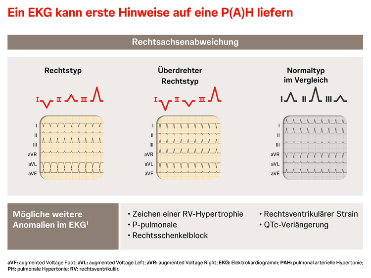 Eine EKG-Anomalie, der bei der P(A)H-Diagnose eine besondere Bedeutung zukommt, ist die Rechtsachsenabweichung. Wird diese nachgewiesen, besteht eine hohe Wahrscheinlichkeit für das Vorliegen einer pulmonalen Hypertonie (PH) oder auch pulmonal arteriellen Hypertonie (PAH). Neben einer Rechtsachsenverschiebung können sich auch weitere Zeichen einer Rechtsherzbelastung im EKG zeigen, dazu gehören:1