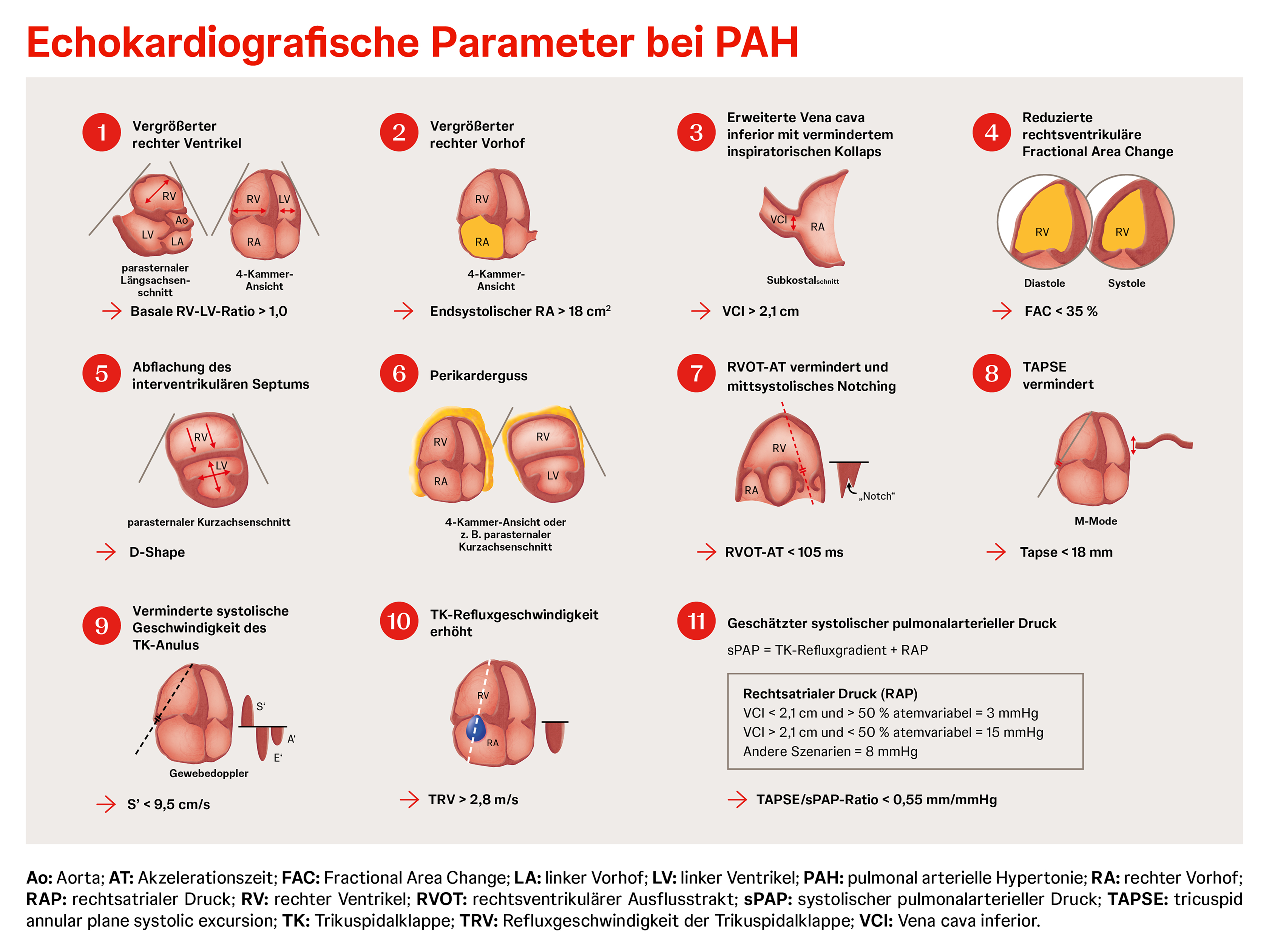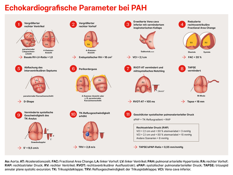 Die verschiedenen Parameter in der Echokardiografie geben Hinweise auf die Morphologie des rechten und linken Herzens, die Funktion von rechtem und linkem Ventrikel sowie Klappenabnormalitäten und erlauben die Abschätzung von hämodynamischen Parametern.1