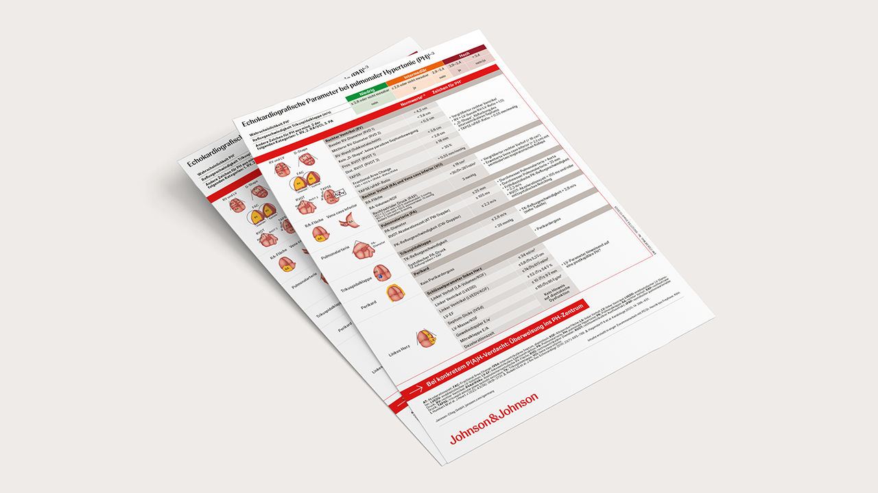 Einfache Diagnostik kann den Weg zur Diagnose entscheidend verkürzen. Erste Hinweise liefern dabei ein Elektrokardiogramm (EKG), Laborwerte wie der NT-proBNP-Wert, bildgebende Diagnostik und Lungenfunktion/Spiroergometrie. Im Verdachtsfall sollte eine echokardiografische Untersuchung erfolgen und – sofern sich der Verdacht bestätigt – eine Rechtsherzkatheteruntersuchung in einem PH-Zentrum.1