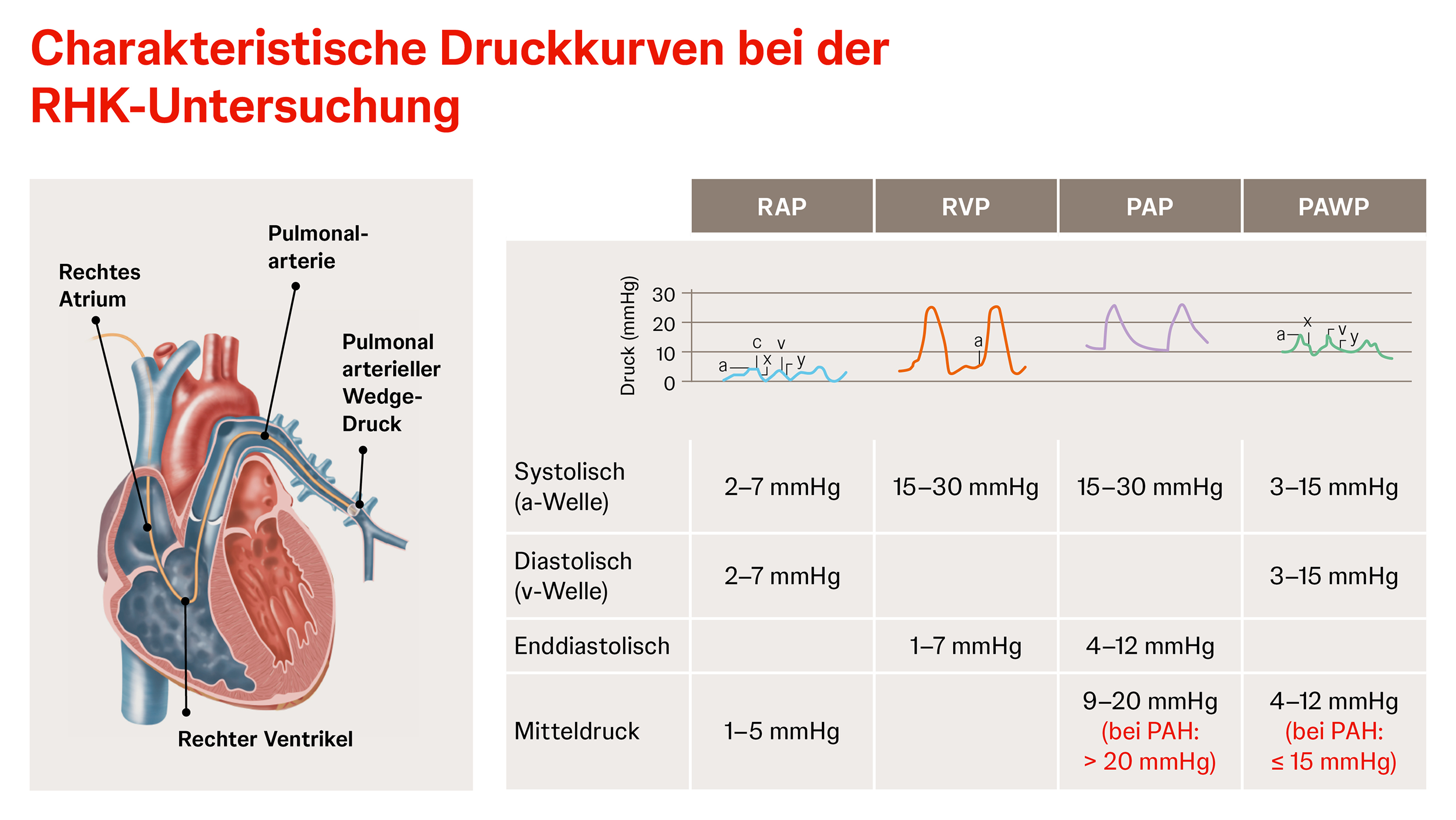 Bei einer Rechtsherzkatheteruntersuchung (RHK-Untersuchung) wird der Rechtsherzkatheter über den rechten Vorhof und Ventrikel direkt in die Lungenarterie eingeführt, sodass verschiedene Parameter direkt im Herzen und in der Lungenarterie gemessen werden können. Der Rechtsherzkatheter ist daher auch die einzige Möglichkeit, mit der ein erhöhter Blutdruck in der Lungenarterie direkt gemessen werden kann und dient als Goldstandard bei der Diagnose der pulmonalen Hypertonie (PH) bzw. der pulmonal arteriellen Hypertonie (PAH). Eine RHK-Untersuchung sollte durchgeführt werden, wenn aufgrund der echokardiografischen Untersuchung der Verdacht auf P(A)H besteht und um die Diagnose zu bestätigen sowie die PH zu klassifizieren (prä- vs. postkapilläre PH bzw. Einteilung in Gruppe 1–5).10