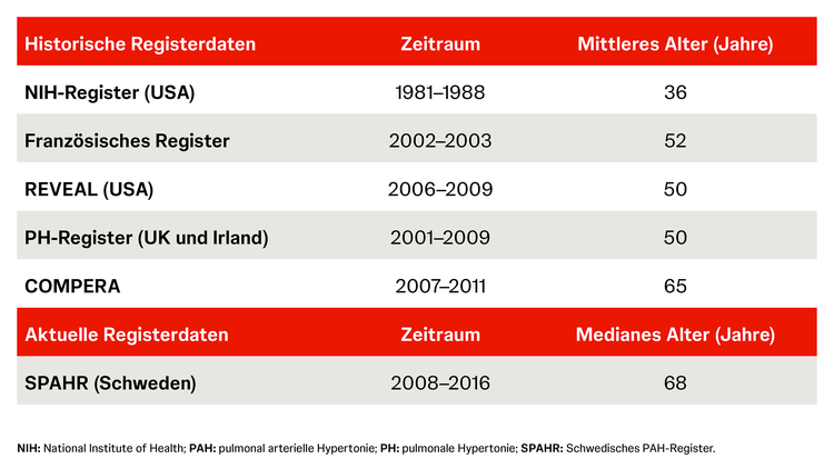 Prinzipiell kann PAH jeden treffen, obwohl bestimmte Risikogruppen, wie z. B. Patient:innen mit systemischer Sklerose oder Erwachsene mit angeborenen Herzfehlern, häufiger von der Lungenerkrankung betroffen sind.1 Registerdaten der letzten Jahrzehnte zeigen außerdem einen kontinuierlich höheren Anteil von Patient:innen, während sich das durchschnittliche Alter bei Diagnose einer idiopathischen PAH erhöht hat. Laut aktuellen Daten aus dem SPAHR-Register ist die:der klassische PAH-Patient:in heute im Median 68 Jahre alt.2 Wie die Auswertung von Registerdaten aus Großbritannien und Irland zeigte, ist dies auch häufig mit einer größeren Anzahl an Komorbiditäten verbunden.3