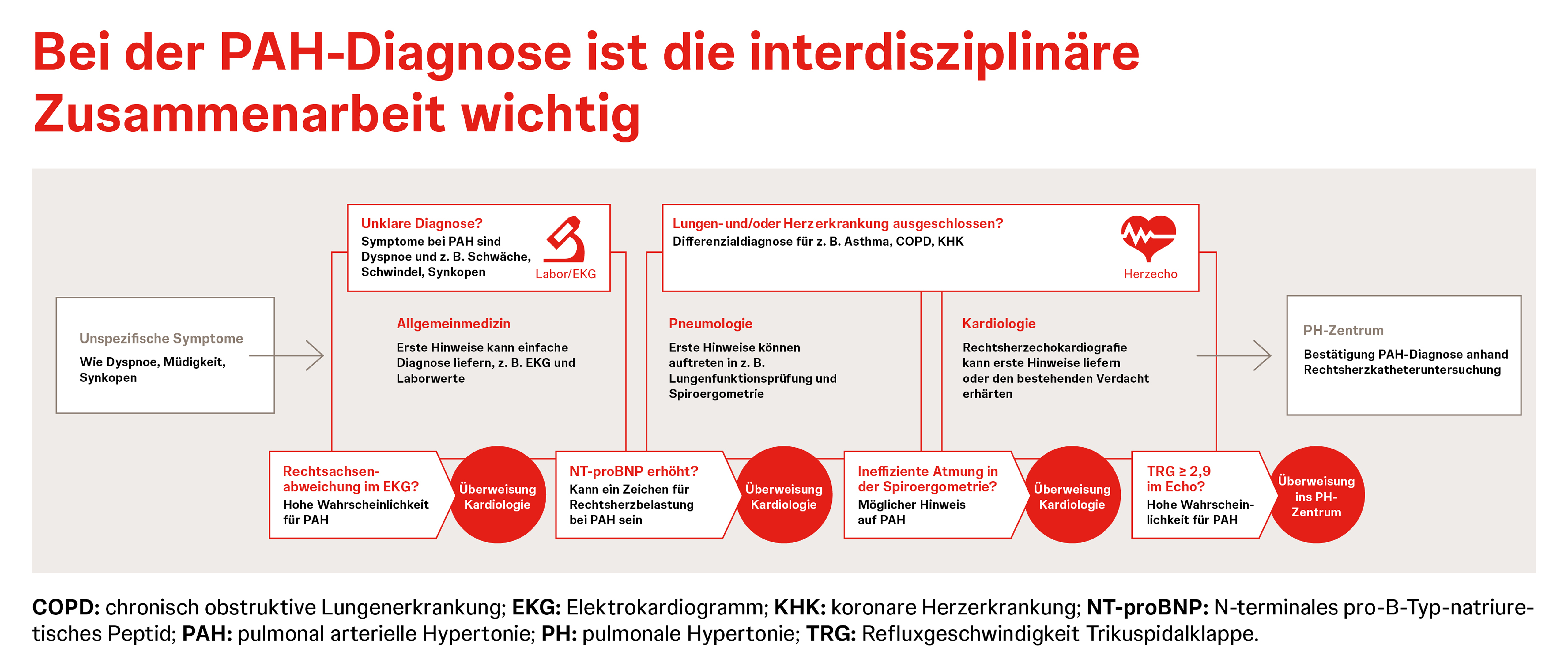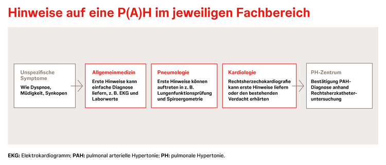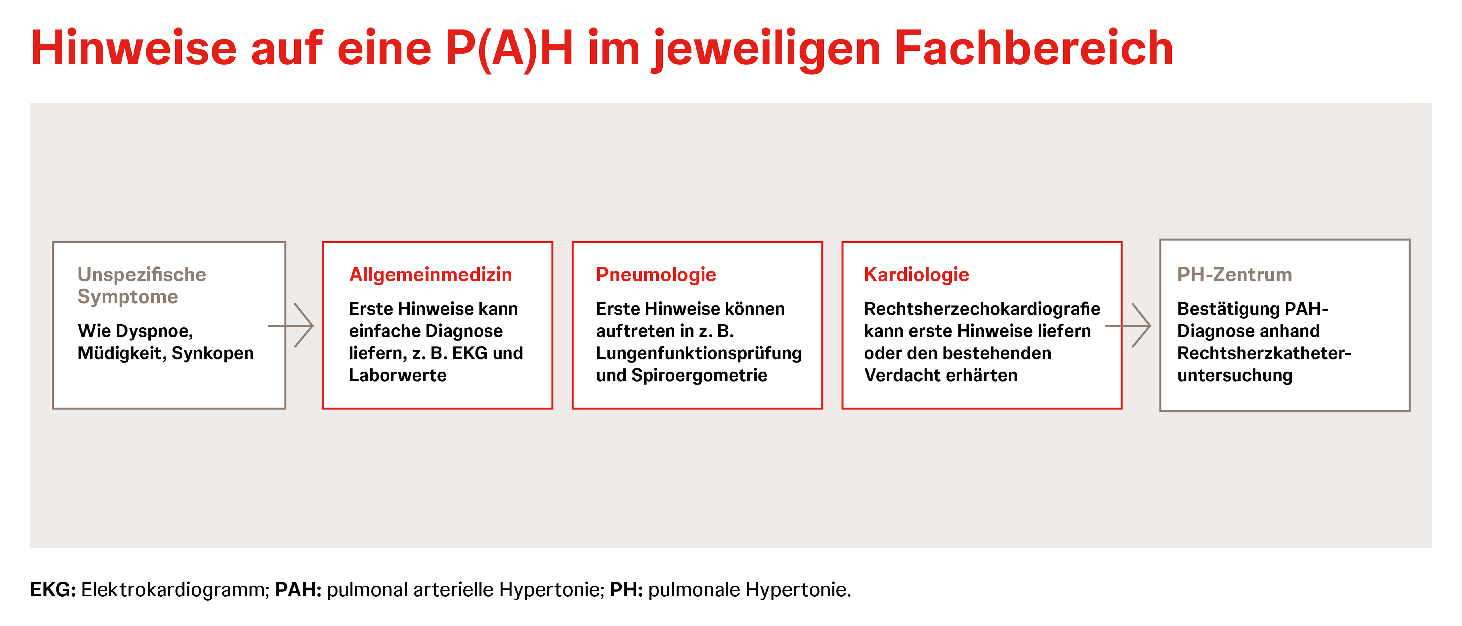 Unspezifische Symptome und das relativ seltene Auftreten der Erkrankung sind unter anderem der Grund dafür, dass die Diagnose der pulmonalen Hypertonie (PH) und pulmonal arteriellen Hypertonie (PAH) in jedem 5. Fall immer noch erst nach 3 Jahren oder länger gestellt wird.1 Eine gute interdisziplinäre Vernetzung zwischen verschieden Fachbereichen ist dabei der Schlüssel für eine rechtzeitige Diagnose. Der Weg und der Fachbereich, der den entscheidenden Hinweis auf die Diagnose bringt, können unterschiedlich sein. Erste Hinweise auf eine P(A)H können sich zwar in verschiedenen Diagnostikmethoden verbergen, aber oft ergibt erst das Gesamtbild einen klaren Verdacht.