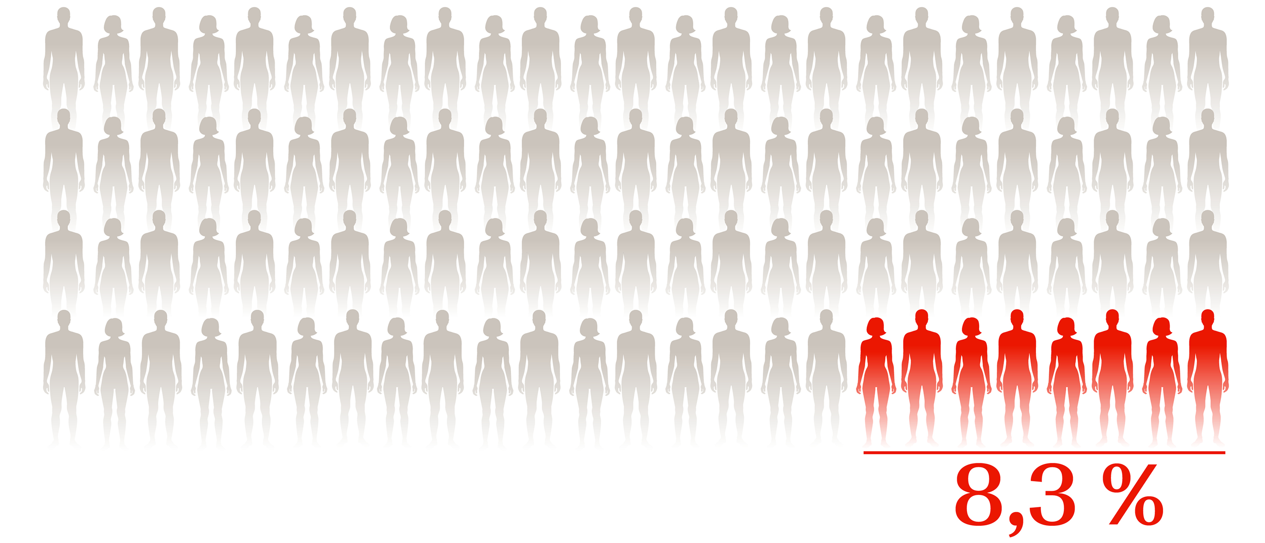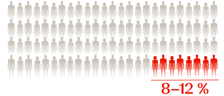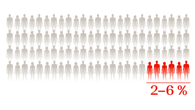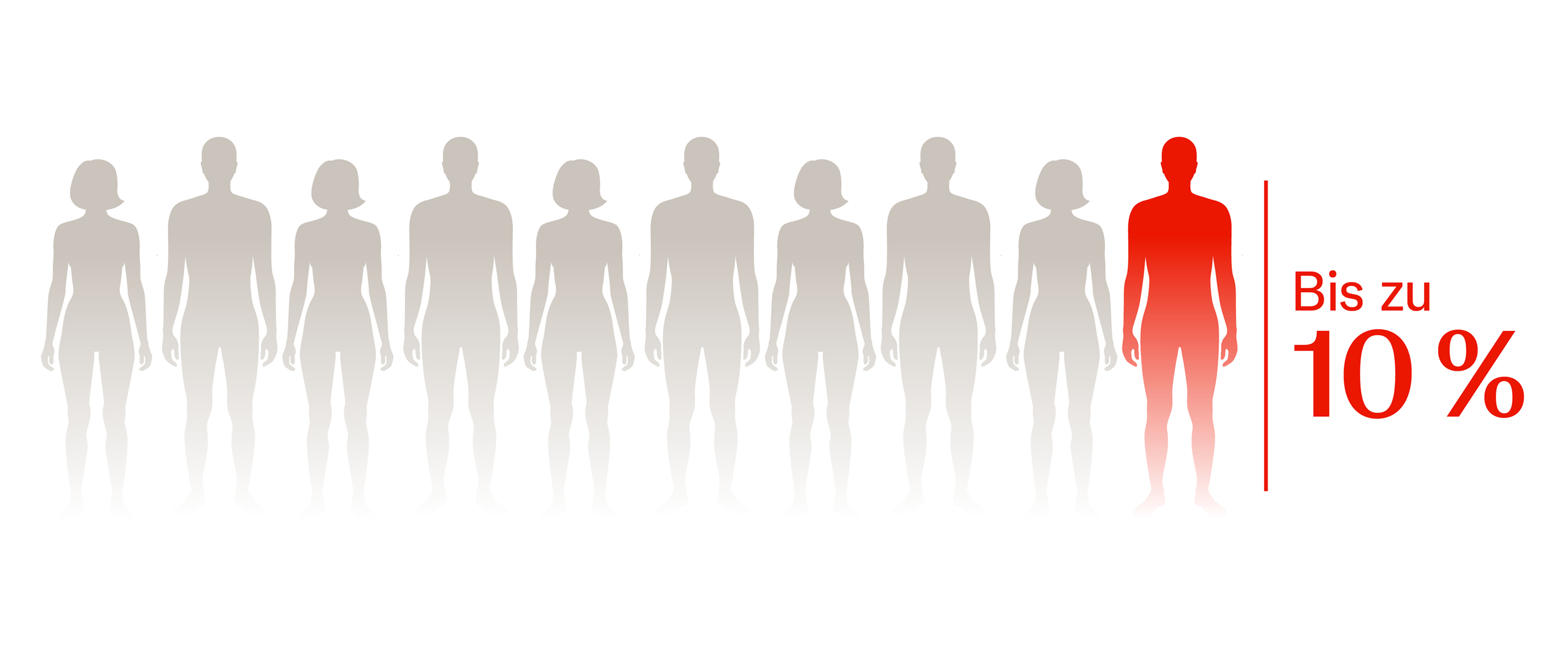 Systemische Sklerose, kurz SSc, ist eine seltene rheumatische Autoimmunerkrankung aus der Gruppe der Kollagenosen. Sie ist gekennzeichnet durch eine Verhärtung der Haut und des Bindegewebes (Fibrose) sowie durch eine Schädigung der Blutgefäße (Vaskulopathie).5 Zu den typischen Symptomen gehören funktionelle Durchblutungsstörungen (Raynaud-Syndrom), geschwollene Finger („puffy fingers“) und Fingergeschwüre (digitale Ulzerationen). Die Symptomatik kann sich auf innere Organe wie Verdauungstrakt, Herz, Niere und Lungen ausweiten. Sind durch die Vaskulopathie auch die Lungenarterien betroffen, können Betroffene eine PAH entwickeln.6,7 Dies geschieht bei 8–12 % der SSc-Patient:innen.8 Man spricht in diesem Fall von einer pulmonal arteriellen Hypertonie in Assoziation mit systemischer Sklerose (PAH-SSc).