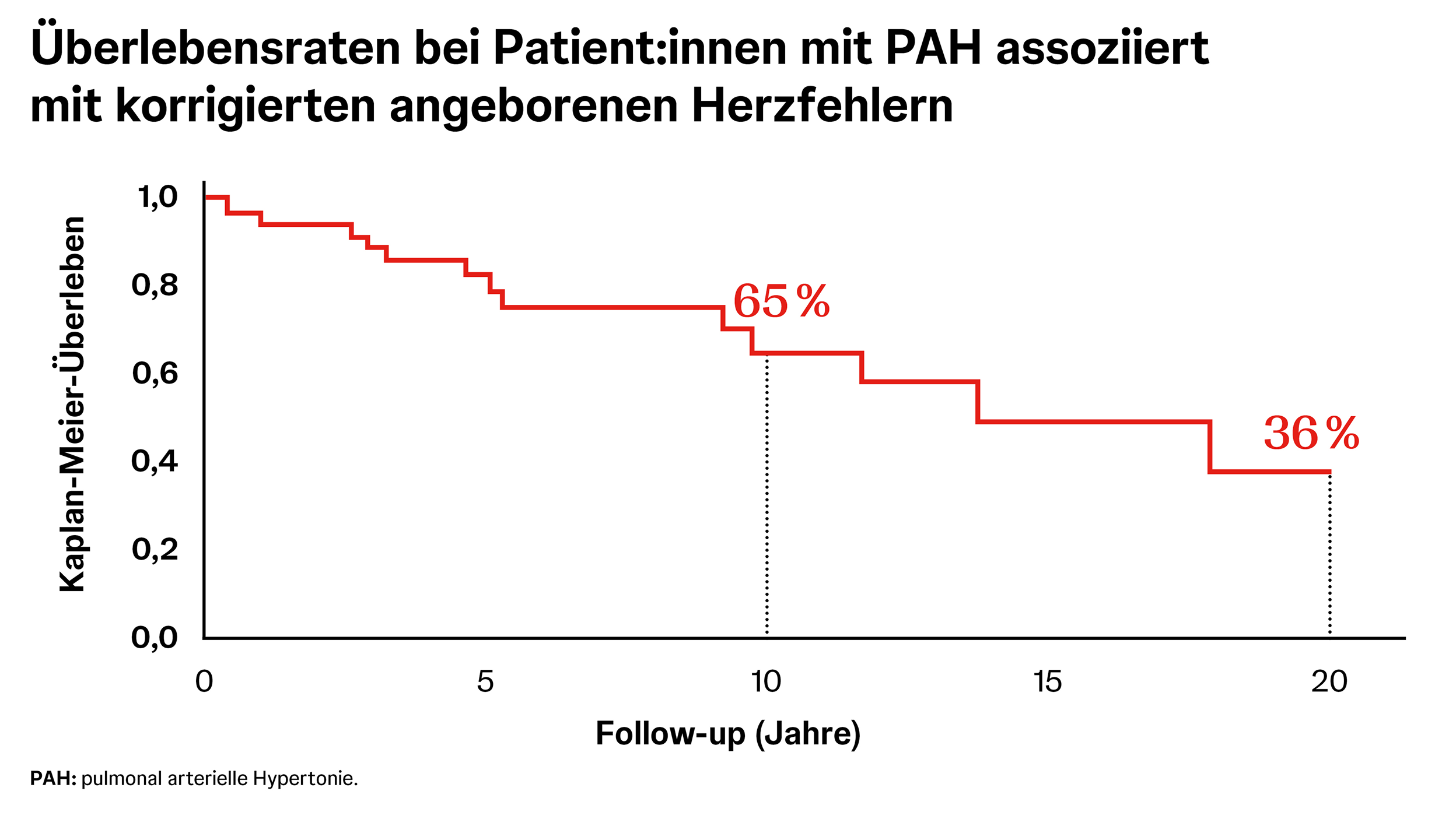 Insgesamt sind die Morbidität und die Mortalität der pulmonal arteriellen Hypertonie (PAH) bei Erwachsenen mit angeborenen Herzfehlern (EMAH) erheblich.18 Grundsätzlich ist das Überleben von EMAH mit PAH abhängig von der klinischen Subgruppe. Während die Überlebensraten für die ersten drei Subgruppen (Eisenmenger-Syndrom, PAH bei Links-Rechts-Shunt und PAH, die zufällig mit einem angeborenen Herzfehler assoziiert ist) nach 10 Jahren noch bei über 80 % liegen, verstirbt bei Patient:innen mit angeborenen korrigierten Herzfehlern 1 von 3 innerhalb von 10 Jahren nach PAH-Diagnose.18