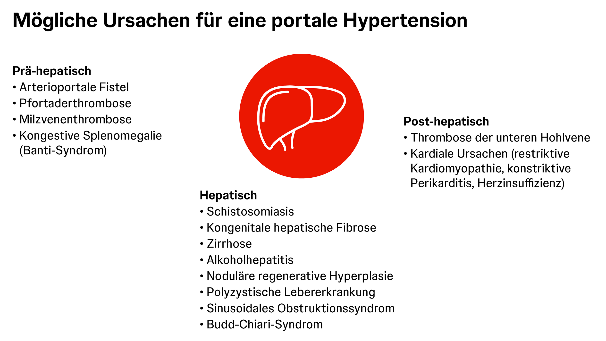 Eine portale Hypertension entsteht, wenn der intrahepatische Widerstand in den Lebergefäßen steigt (z. B. durch Leberzirrhose) und ein erhöhter Blutfluss aufgrund erhöhter Vasodilatation im Splanchnikus-System (Bauchorgane) auftritt. Dies kann verschiedene prä-hepatische, intrahepatische und post-hepatische Ursachen haben, in bis zu 90 % der Fälle ist jedoch eine Leberzirrhose der Auslöser für eine portale Hypertension.30