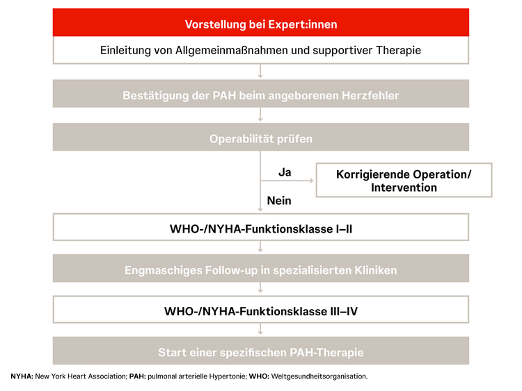 Da für die Diagnose einer pulmonal arteriellen Hypertonie (PAH) in Assoziation mit angeborenen Herzfehlern kein spezifischer Diagnosealgorithmus besteht, kann prinzipiell der P(A)H-Diagnosealgorithmus verwendet werden. Neben der korrekten Diagnose des zugrunde liegenden Herzfehlers sollte auch bei dieser Form der PAH eine funktionelle und hämodynamische Abstufung erfolgen. Eine frühe Diagnose ist sehr wichtig, da eine chirurgische oder interventionelle Korrektur des Herzfehlers den klinischen Verlauf und die Prognose bei PAH verbessern kann. Aufgrund der Komplexität des Krankheitsbildes sollte die Diagnose multidisziplinär abgeklärt werden und alle Patient:innen sollten an zertifizierte Spezialist:innen und EMAH-Zentren angebunden werden.15