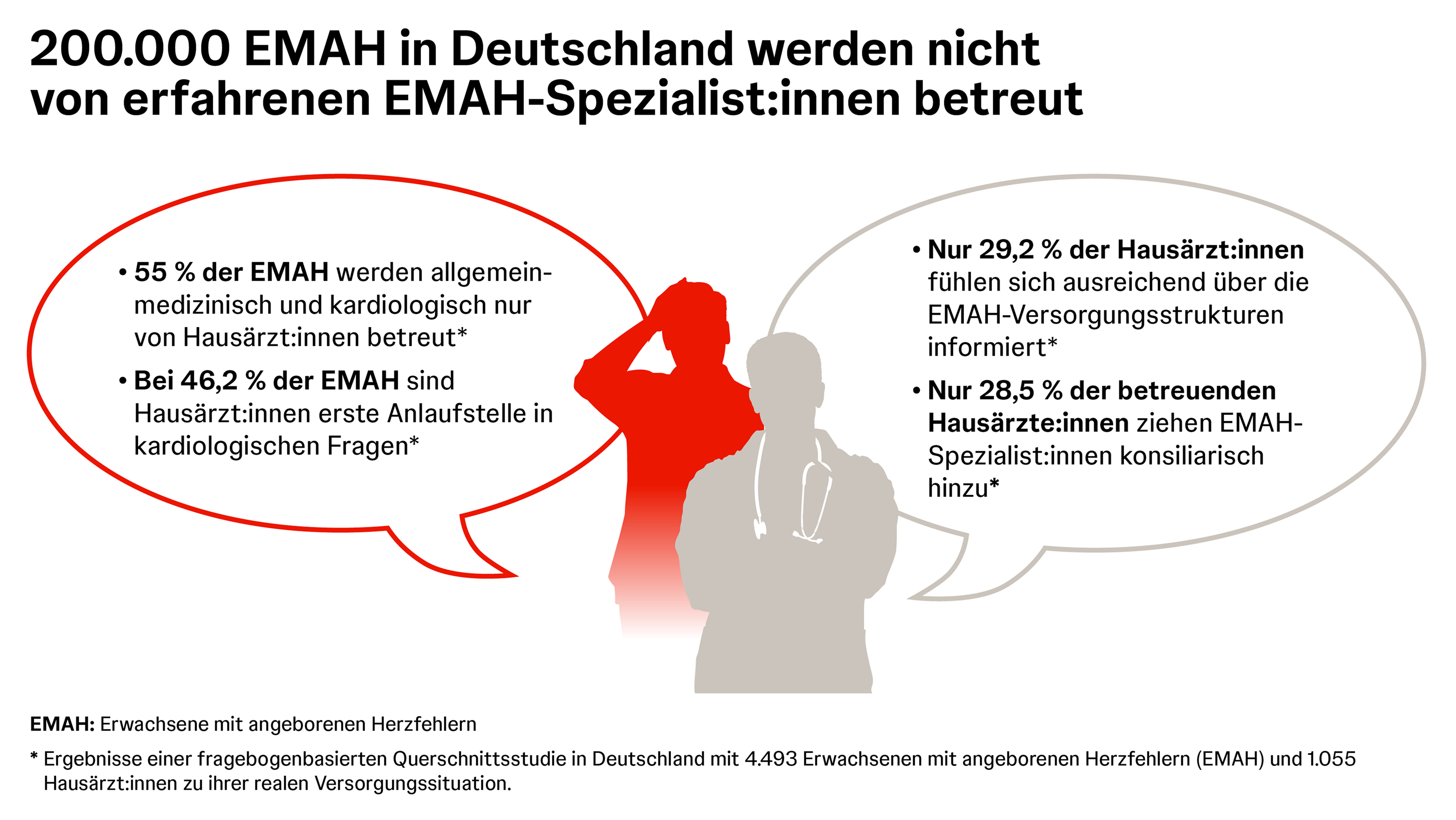 Eine fragebogenbasierte Querschnittsstudie hat gezeigt, dass die Versorgungssituation für Erwachsene mit angeborenen Herzfehlern (EMAH) in Deutschland stark verbesserungsbedürftig ist. Ende 2020 umfasste das Versorgungsnetz in Deutschland 20 „überregionale EMAH- Zentren“, 10 „EMAH-Schwerpunktkliniken oder -praxen“ sowie über 300 zertifizierte Kardiolog:innen oder Kinderkardiolog:innen.25 Obwohl der Bedarf nach spezialisierter Betreuung bei EMAH hoch ist, werden der Umfrage nach mehr als die Hälfte allgemeinmedizinisch und kardiologisch nur von ihren Hausärzt:innen betreut und sind nicht an ein spezialisiertes EMAH-Zentrum angebunden.25 Weniger als ein Drittel der Hausärzt:innen fühlen sich ausreichend über die EMAH-Versorgungsstrukturen informiert.25