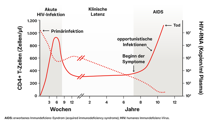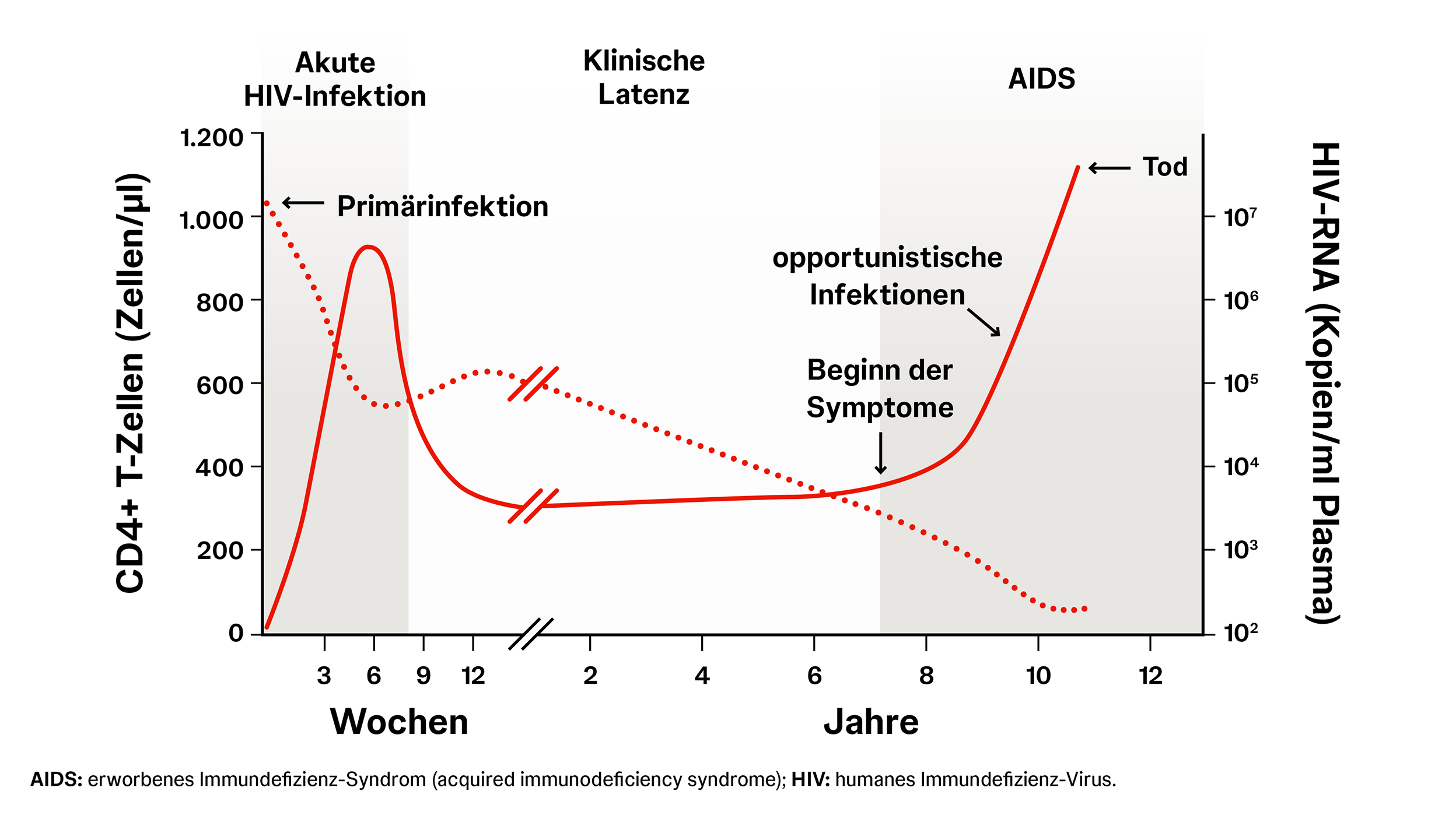 Weltweit sind etwa 34 Millionen Menschen mit dem humanen Immundefizienz-Virus (HIV), einem Lentivirus aus der Familie der Retroviren, infiziert. Das Virus enthält zwei Einzelstränge RNA, die in der Wirtszelle durch die viral kodierte Reverse Transkriptase in Doppelstrang-DNA konvertiert und in das Wirtsgenom eingesetzt werden. Dort verbleibt das Virus entweder latent oder wird alternativ von der Zelle transkribiert und vermehrt sich auf diese Art weiter. Bei einer HIV-Infektion unterscheidet man 3 Stadien: akute Infektion, klinische Latenz und erworbenes Immundefizienz-Syndrom (acquired immunodeficiency syndrome (AIDS)), das finale Stadium einer HIV-Infektion. AIDS wird entweder durch weniger als 200 CD4+ T-Zellen pro µl oder das Auftreten von spezifischen HIV-assoziierten Infektionen (Infektionen mit Zytomegalievirus, Varizella-Zoster-Virus, BK-Virus, Herpes-simplex-Virus, Pneumocystis jirovecii, Toxoplasma gondii oder Pilzen) definiert. Ohne spezifische Therapie entwickelt die Hälfte der HIV-infizierten Patient:innen innerhalb von 10 Jahren AIDS.27