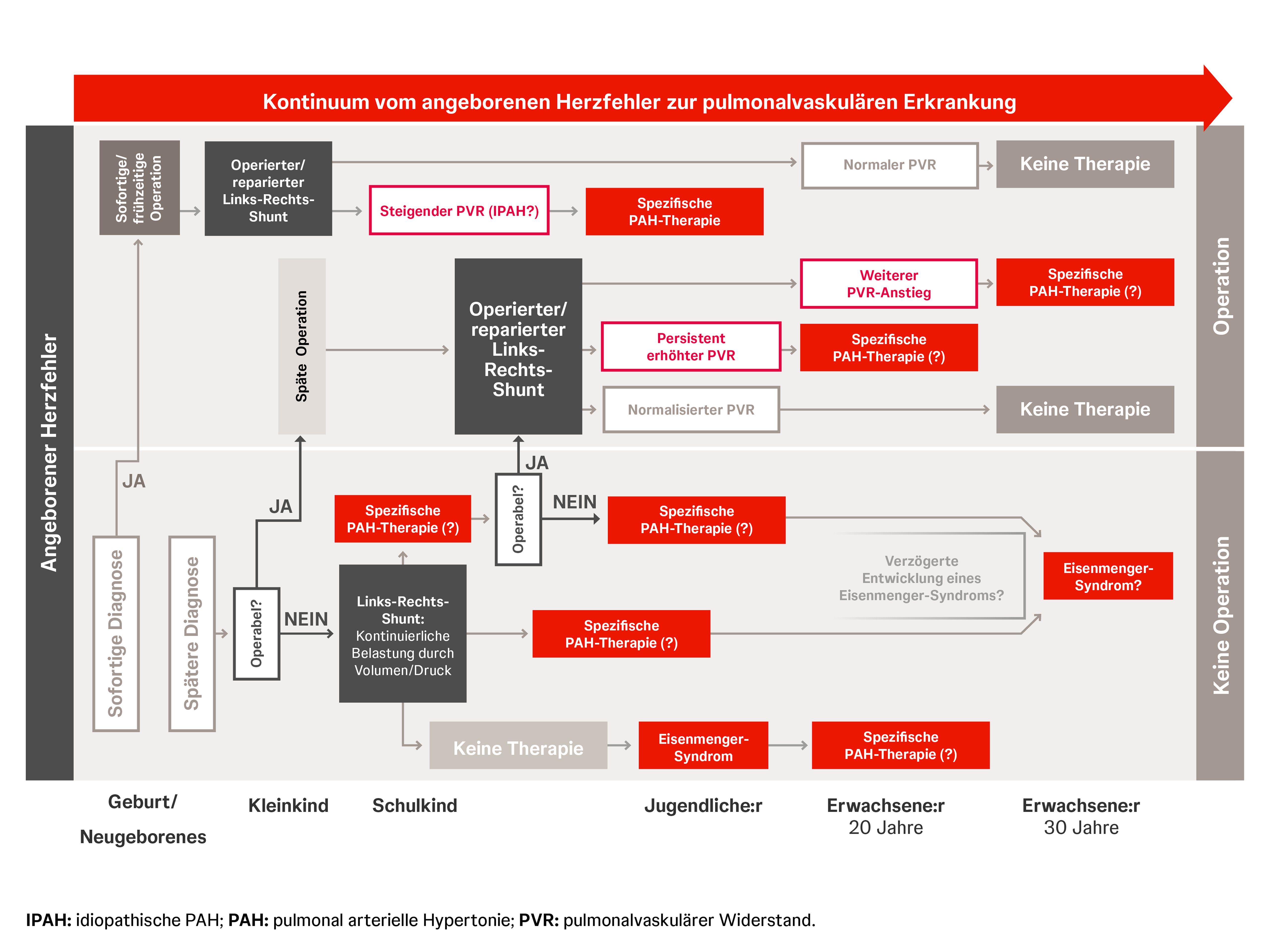 Angeborene Herzfehler in Assoziation mit PAH werden weiterführend noch einmal verschiedenen Klassen zugeordnet. Diese umfassen das Eisenmenger-Syndrom, PAH bei Links-Rechts-Shunt, PAH, die zufällig mit einem angeborenen Herzfehler assoziiert ist, und PAH nach Defektkorrektur.16