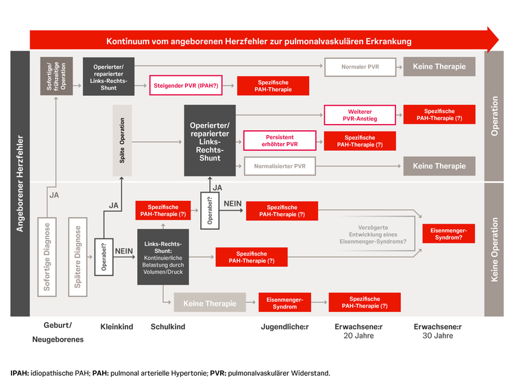 Laut Schätzungen entwickeln bis zu 10 % der Patient:innen mit angeborenen Herzfehlern eine P(A)H.14 Diese Form der PAH umfasst eine sehr heterogene Patientenpopulation und das klinische Bild kann sich deutlich von anderen P(A)H-Formen unterscheiden.1