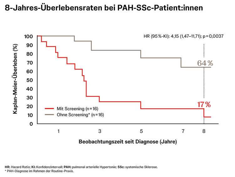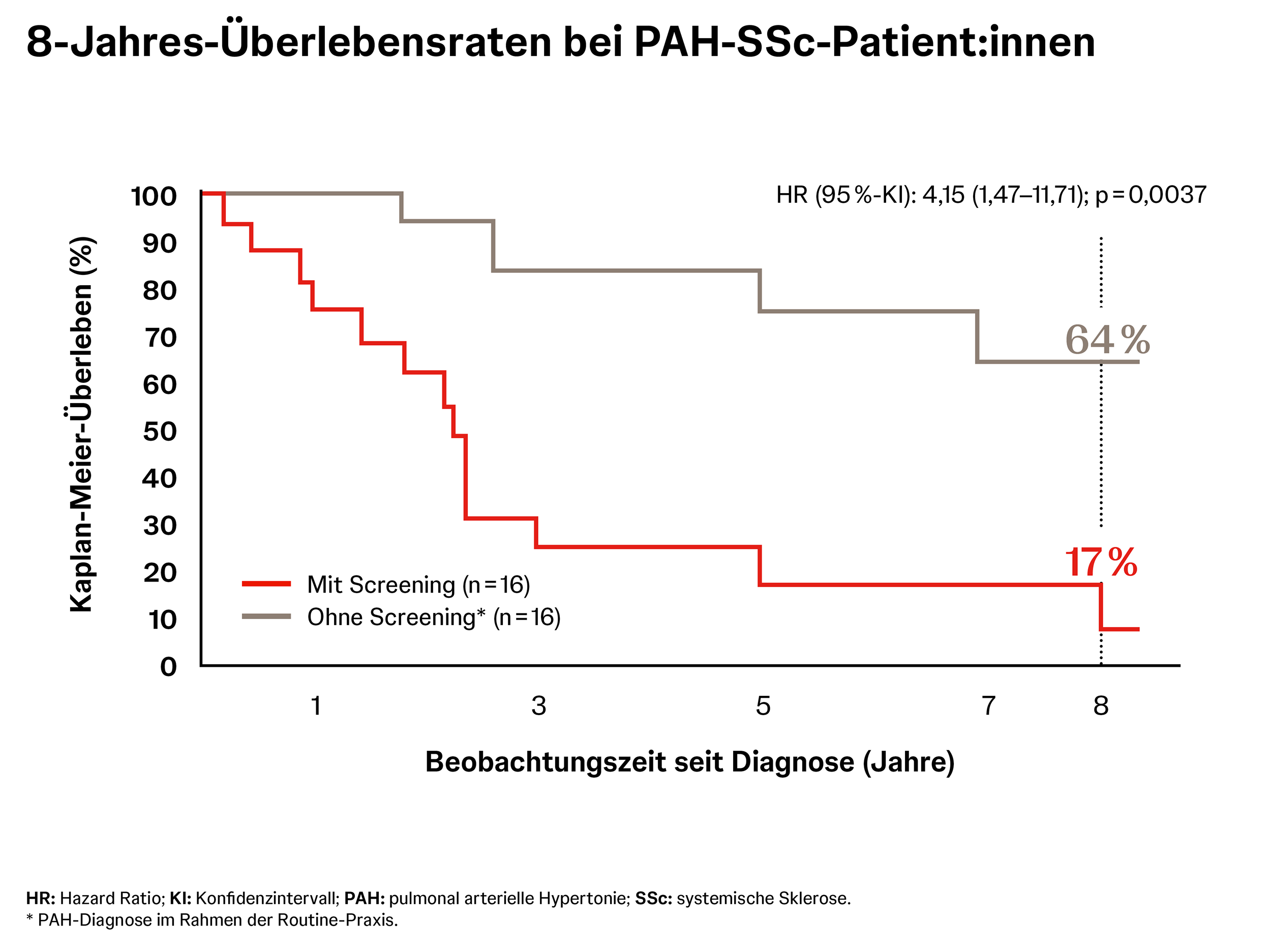 Studiendaten zeigen, dass durch ein gezieltes PAH-Screening bei Patient:innen mit systemischer Sklerose deutlich mehr PAH-Patient:innen in früheren Stadien (Funktionsklasse I oder II) identifiziert werden als durch Routineuntersuchungen ohne Screening. Dies zeigte sich auch bei der Mortalität. Bei gescreenten Patient:innen lag die 8-Jahres-Überlebensrate bei 64 %, während diese bei nicht gescreenten Patient:innen nur bei 17 % lag.11 Aus diesem Grund empfehlen die Leitlinien bei Patient:innen mit systemischer Sklerose ein jährliches PAH-Screening. Ergibt sich daraus der Verdacht auf eine PAH, sollte umgehend eine Überweisung an ein PH-Zentrum erfolgen, um die Diagnose anhand einer Rechtsherzkatheteruntersuchung zu bestätigen und eine gezielte PAH-Therapie starten zu können.1