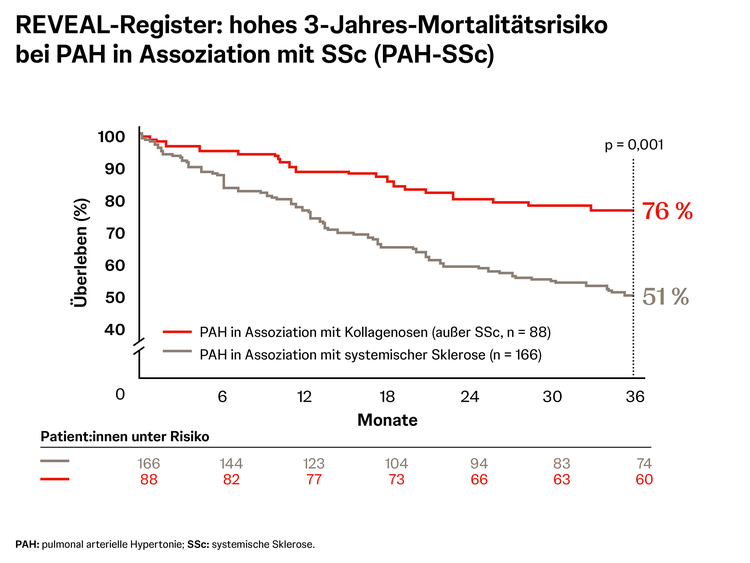 Pulmonal arterielle Hypertonie in Assoziation mit systemischer Sklerose verläuft oft schwerwiegender als idiopathische PAH (IPAH). Das spiegelt sich zum Beispiel auch in Registerdaten aus Kanada und den USA wider, die zeigen, dass mehr als 50 % der Todesfälle bei systemischer Sklerose durch PAH bedingt sind.9 Daten aus dem REVEAL-Register zeigten außerdem, dass die Prognose bei PAH in Assoziation mit systemischer Sklerose mit einer Überlebensrate von 51 % nach 3 Jahren besonders schlecht ist im Vergleich zu anderen Kollagenosen mit einer Überlebensrate von 76 %.10 Eine frühzeitige Diagnose und anschließende Behandlung mit gezielten PAH-Medikamenten sind daher für die Verbesserung der Prognose sehr wichtig.