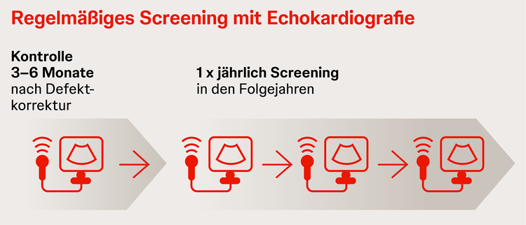 Daten aus dem COMPERA-Register zeigen, dass PAH bei mehr als 60 % der EMAH erst im fortgeschrittenen Stadium (WHO-Funktionsklasse III oder IV) diagnostiziert wird.19 Insbesondere bei Erwachsenen mit korrigierten angeborenen Herzfehlern wird daher ein regelmäßiges PAH-Screening mit Echokardiografie empfohlen.20, 21